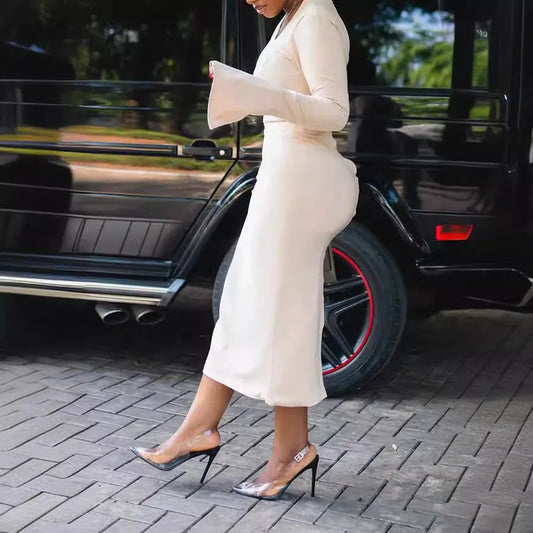 Robe longue irrégulière épaule inclinée manches longues lanterne