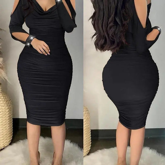 Robe mi-longue moulante à col rond manches longues sexy décontractée