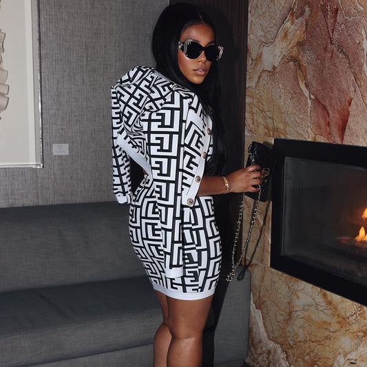 Conjunto de chaqueta abotonada de cuello redondo y manga larga y falda corta