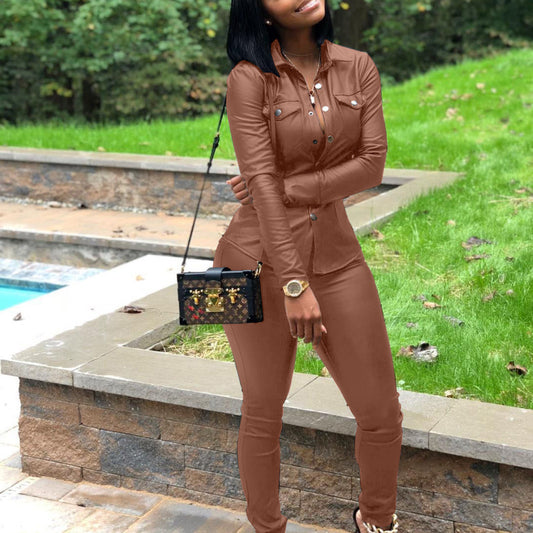 Conjunto de camisa de manga larga y pantalón de piel sintética