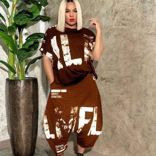 Conjunto de top ancho de manga corta y pantalón harén con estampado de letras