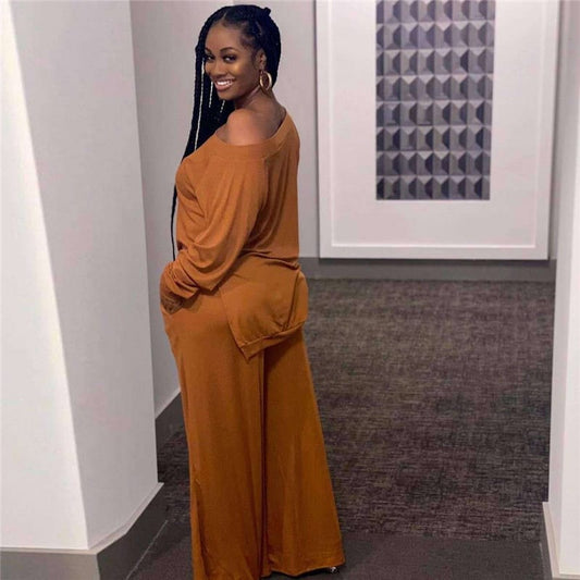 Conjunto de top casual de manga larga y pantalones de pierna ancha de color sólido