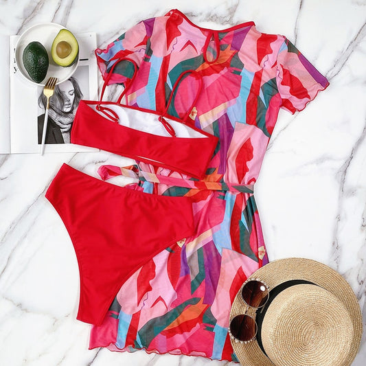 Traje de baño de tres piezas, top de bikini, parte inferior con bustier, estampado gráfico sexy