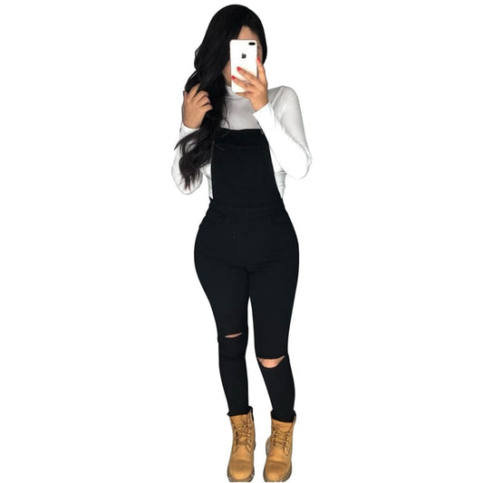 Mono vaquero ajustado con tirantes ajustables y detalle roto