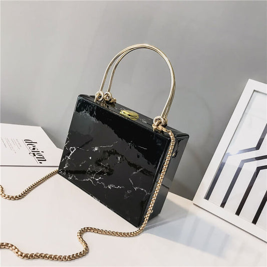 Bolso de noche cuadrado con diseño acrílico y cadena dorada